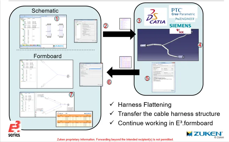 E3.3DRouting Bridge enables a designer to integrate the electrical harness design with all major MCAD vendors. Electrical harness details such as connector, terminals, splices and net list information are transferred to the MCAD system and the length, structure data and harness are fed into E3, where the final details are added for final manufacturing. Routing Bridge works in conjunction with the E3 cable. The supported MCAD systems are as follows:-